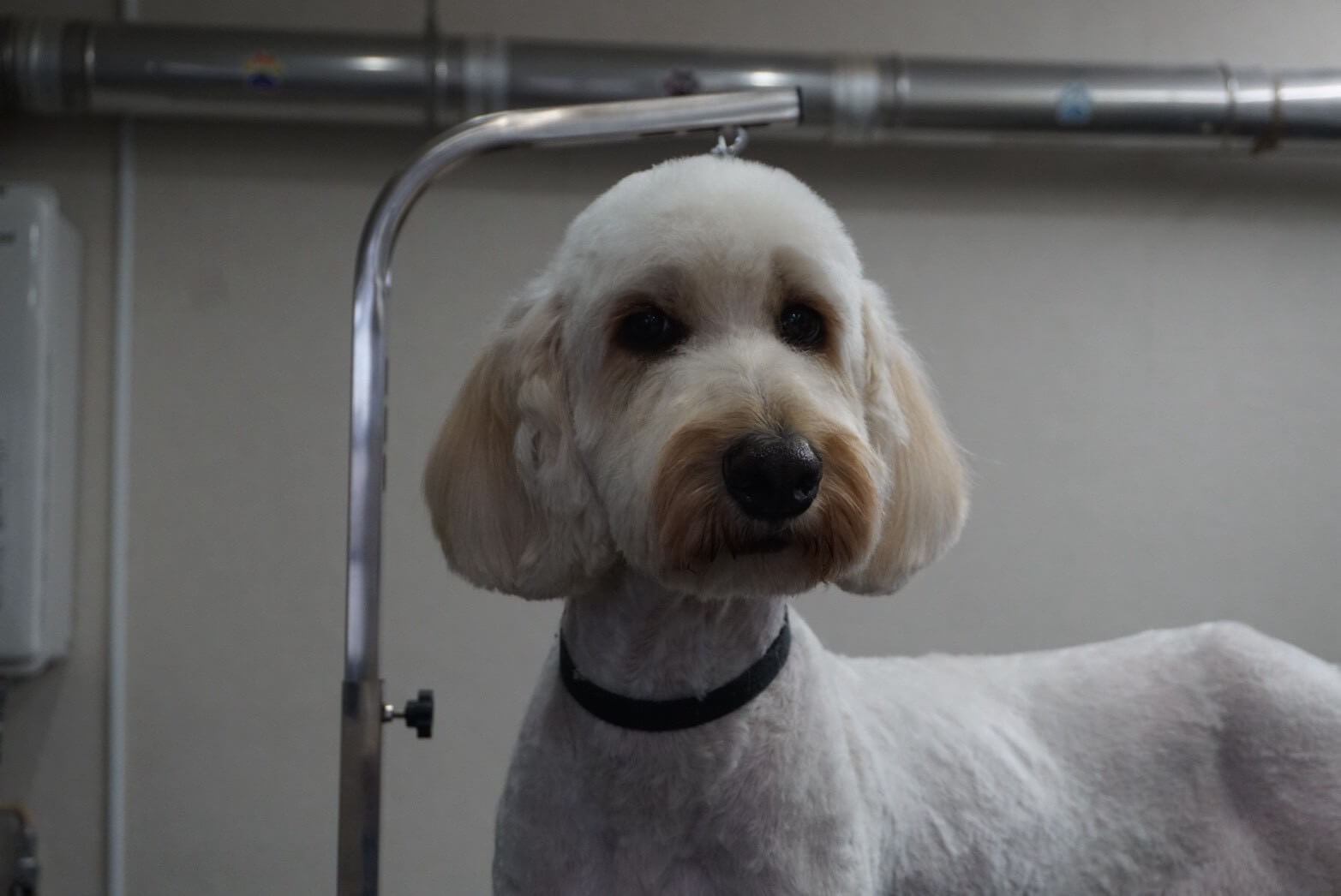 - お口周りのチャームポイント: ゴールデンドゥードルちゃんの特徴でもある、お口の周りの茶色い毛を活かして、ふんわり丸くカット。優しいお顔立ちがさらに引き立ちますね😊
