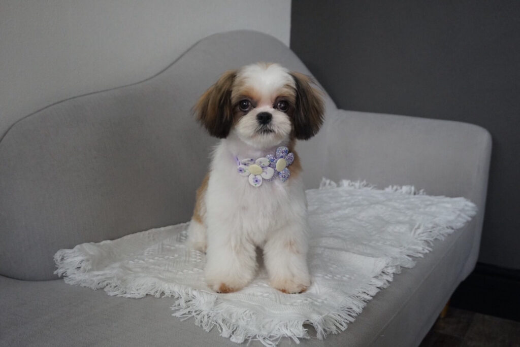 見てください、このあどけない表情!!!🥺✨ まだ子犬ちゃんならではの、ふわふわ・コロコロとしたフォルムがたまりませんっ! 首元には、春らしいパステルカラーのお花のチョーカーをプレゼント🌸 真っ白とブラウンの綺麗な被毛に、パープルのお花がとってもよく似合っていますよね😍