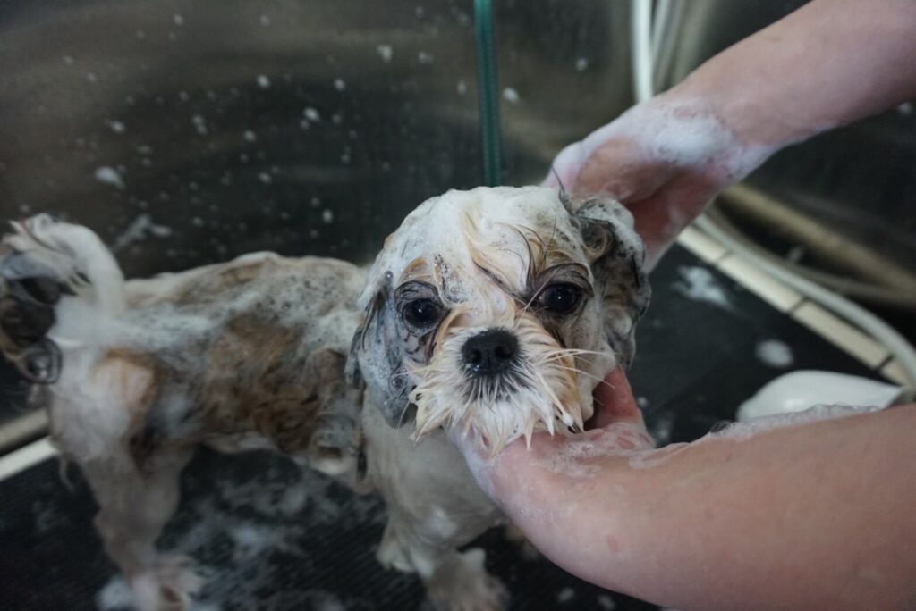 スタッフの手にちょこんと顎を乗せて、すっかりお任せモード🥺 濡れるとちょっぴりスリムになっちゃうのも、シャンプー中ならではの可愛いポイントです(笑)。