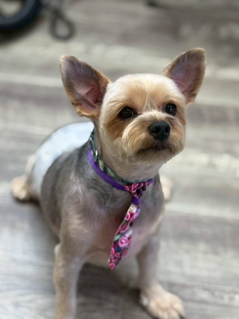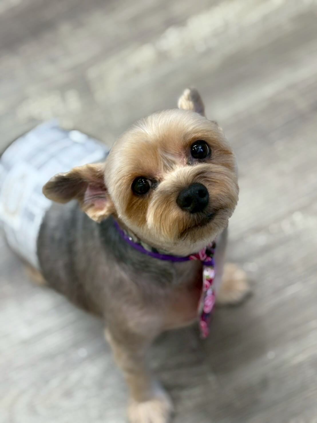 お耳をピーン!と立てたポーズもバッチリきまってます😎📸 今日は仕上げに、紫色の首輪とお揃いカラーのおしゃれな花柄ネクタイ👔を着けてみました! チェック柄のお洋服とも相性バツグンで、完全にサロンの「おしゃれ番長」認定です👑✨