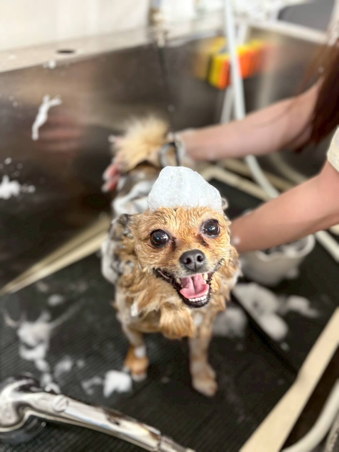 じゃーん!見てください、この見事な「あわあわ帽子」!☁️🎩✨ 頭の上にたっぷりの泡を乗せて、カメラに向かって満面の笑みを見せてくれています😆