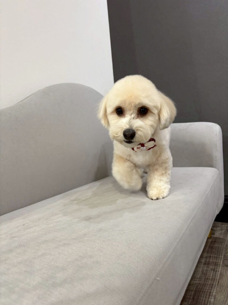 モンシュシュの待合スペースにあるグレーのソファは、お迎え待ちのワンちゃんたちがくつろぐ特等席であり、最高のアングルで写真が撮れる「魔法のソファ」でもあります✨