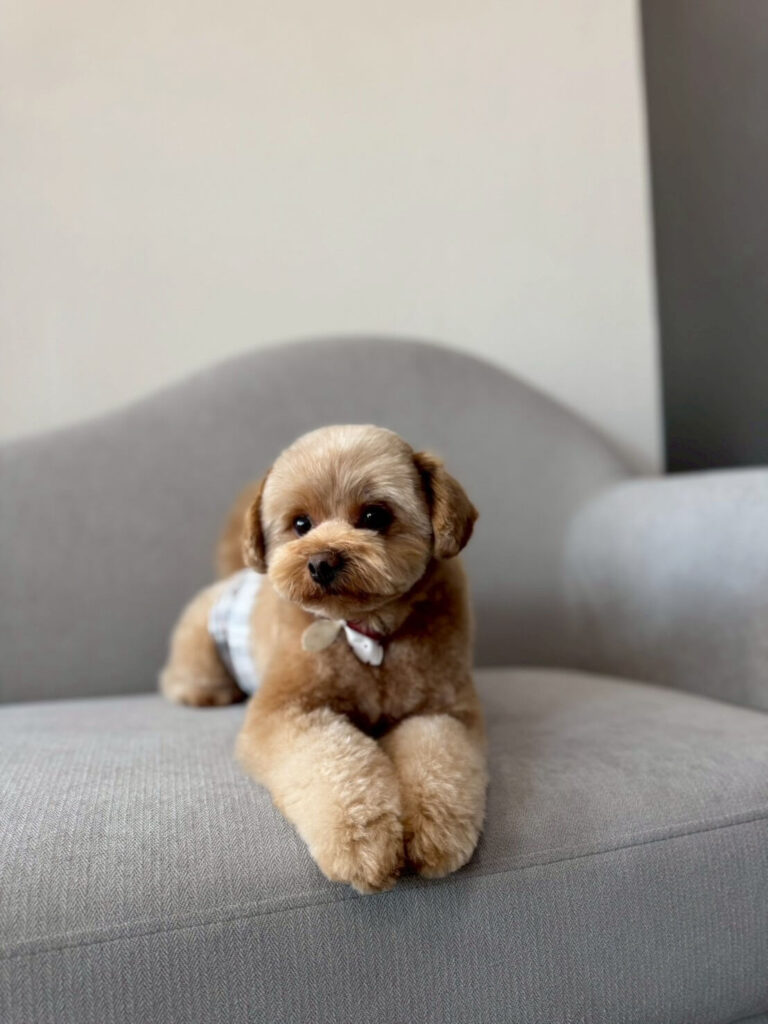 ソファの横にあるピンク色のお花が入った花瓶と比べても、その小ささが分かりますよね! まるで「いらっしゃいませ〜!」とお出迎えしてくれているみたい。このつぶらな瞳に見つめられたら、スタッフ一同、メロメロです😍 トリミングを頑張った後の、リラックスタイムかな?😊