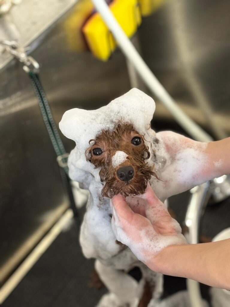 皮膚ケアといえば、モンシュシュ自慢の「泡パック」!🛁 こちらのトイ・プードルちゃん、頭の上にてんこ盛りの泡が!☁️👀