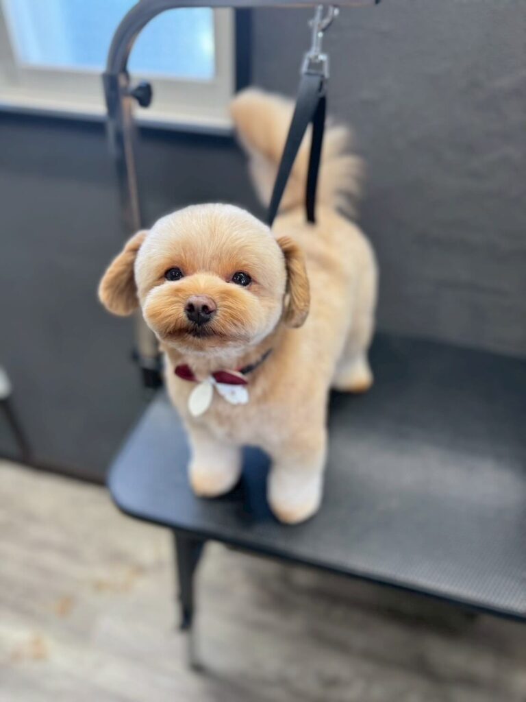 白いマットの上で、ビシッとポーズを決めてくれました。 まるでこれからパーティーにでも行くみたい🎉 モンシュシュでは、トリミング後の記念写真も大切にしています。その子の個性が光る、最高の一枚を撮らせていただきます📸