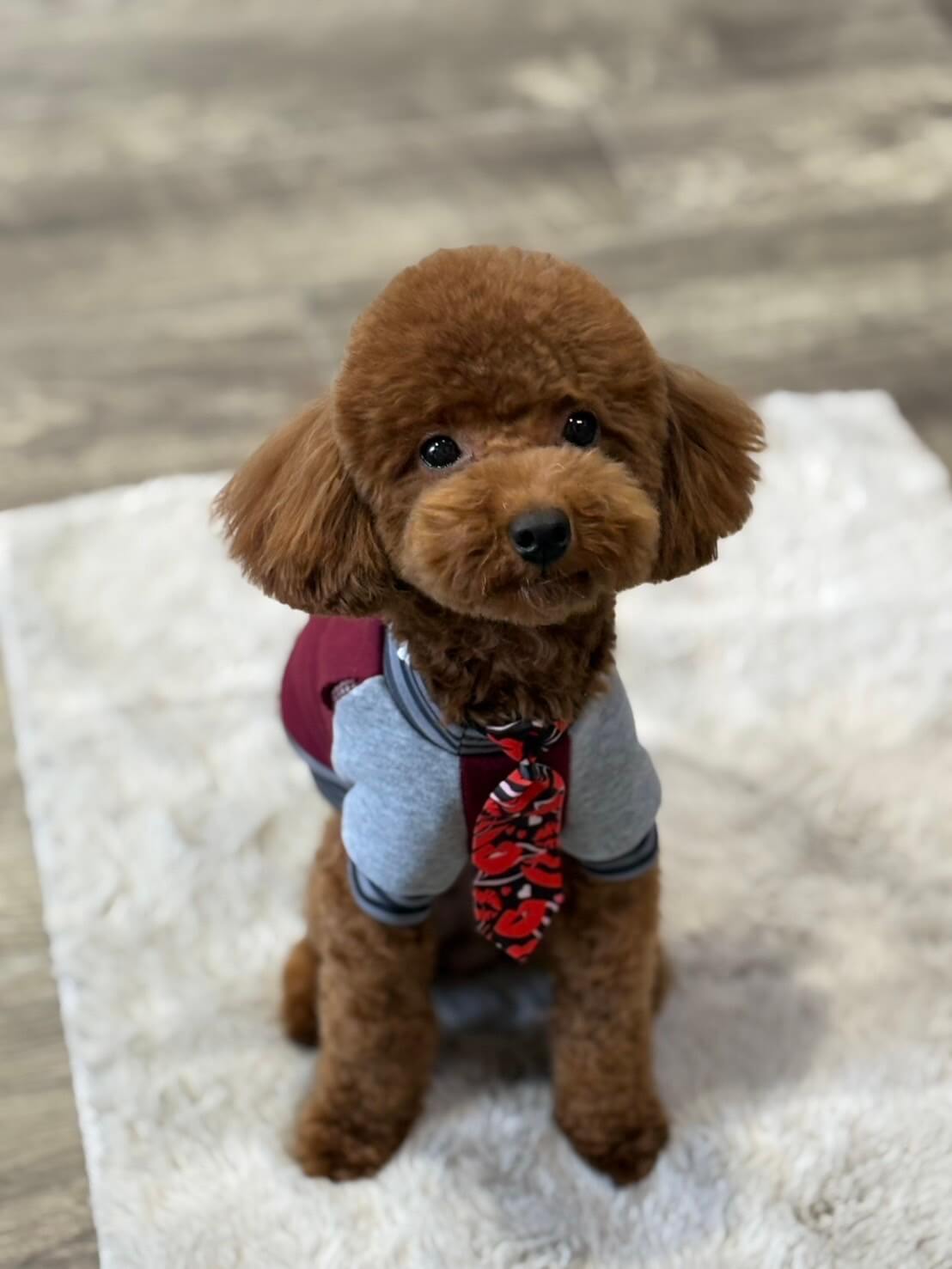 トリミングが終わったら、お洒落も忘れずに! 赤いお洋服に、なんと赤と黒のネクタイを締めたトイ・プードルちゃん!お、お洒落すぎる…!🕶️✨