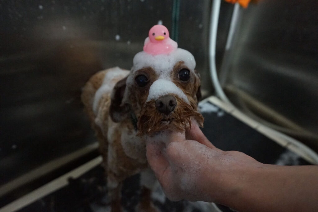 見てください、このとろけそうな表情!🥺💖 モコモコの泡帽子のてっぺんに、ピンクの小さなアヒルちゃんをチョコン。鼻先にも泡がついちゃって、まるでサンタさんみたいですね🎅