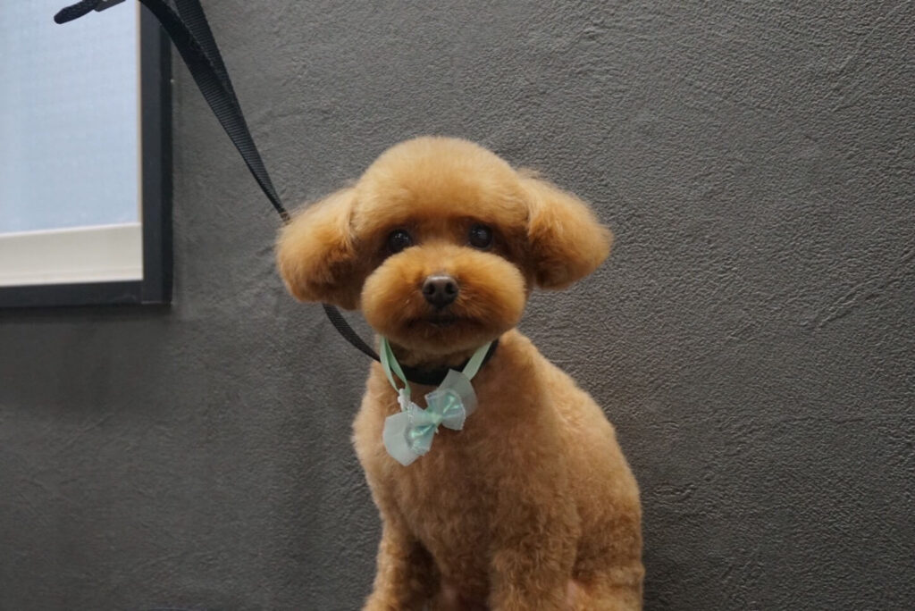 なんということでしょう!💖 お顔周りも丸く整えて、まるで高級テディベアのような仕上がりになりました。 首元には、春の芽吹きを感じさせる爽やかなライトグリーンのリボンをチョイス🎀 フワフワの茶色い被毛に映えて、とってもお洒落ですよね!