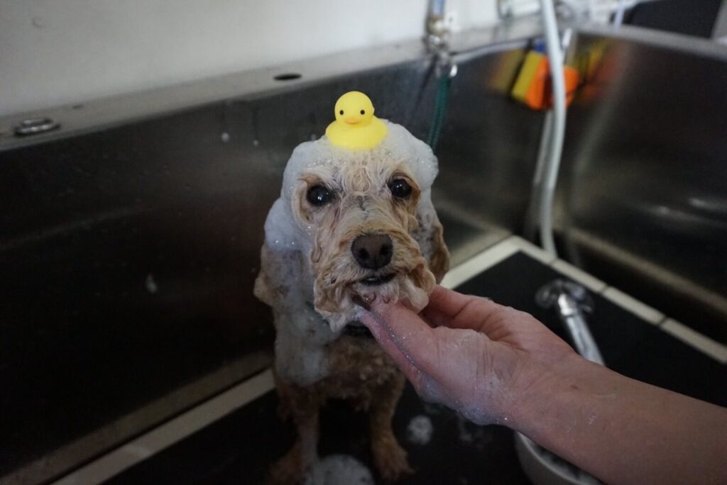 見てください、このとろけるような表情🥺💖 頭の上にモコモコの泡帽子を作って、その上にイエローのアヒルちゃんをチョコン! モンシュシュのシャンプーは、毛穴の奥の汚れを優しく包み込んで落とすので、ワンちゃんもエステ気分でリラックス。 春の雪解け泥や埃も、これですっきりリセットです🧼✨